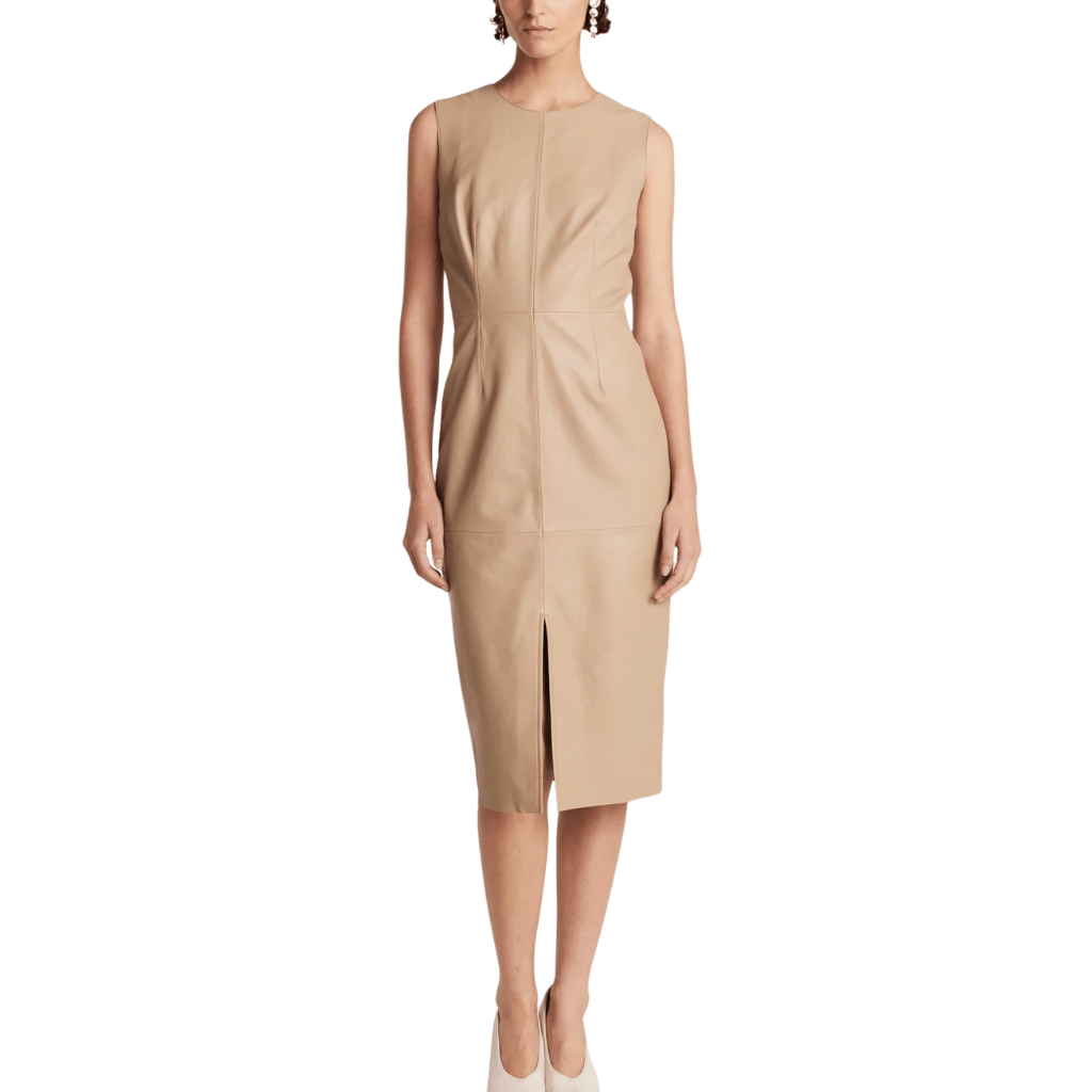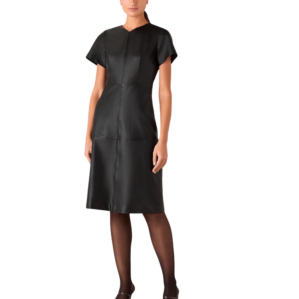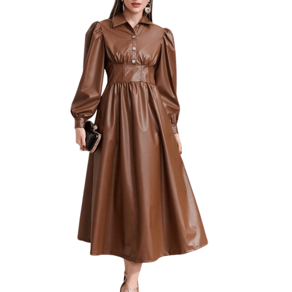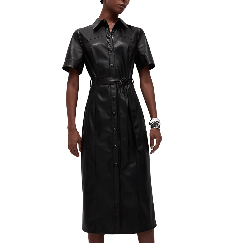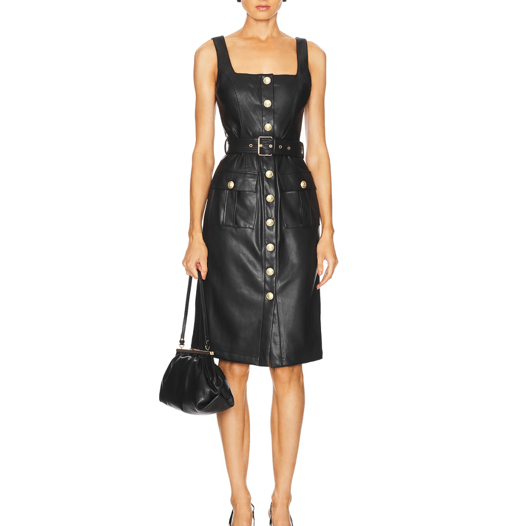 A button front leather dress looks similar to a shirt dress but more structured. This style is very popular because it looks simple and stylish at the same time.
