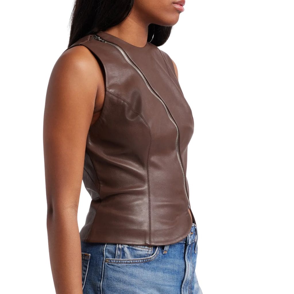 Upgrade your wardrobe with this Classic Asymmetric Zip Front Leather Top, made from real lambskin leather. Featured with a smooth jewel neckline and sleeveless cut, which gives you a minimalistic look and perfect corporate wear.