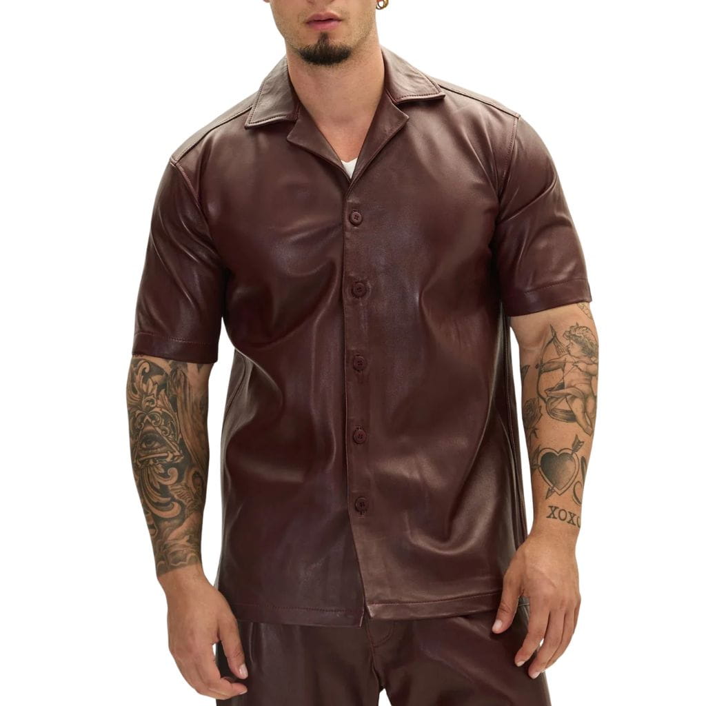 Add a bold and stylish edge to your summer wardrobe with this Burgundy Short Sleeve Men Leather Shirt. Crafted from 100% lambskin leather, this leather shirt offers comfort.
