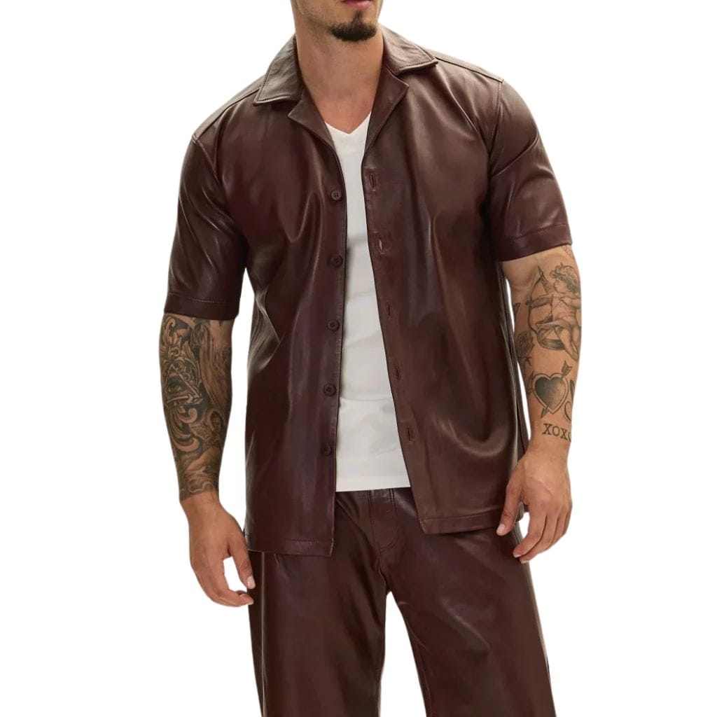 The short-sleeve design keeps it breathable and easy to wear, while the sharp-point collar adds a clean, refined touch. This is a modern fashion leather shirt featuring a classic button-down front, and paneled detailing enhances its structure and gives it a sleek, tailored look. A smooth inner lining provides added comfort and durability for all-day wear.