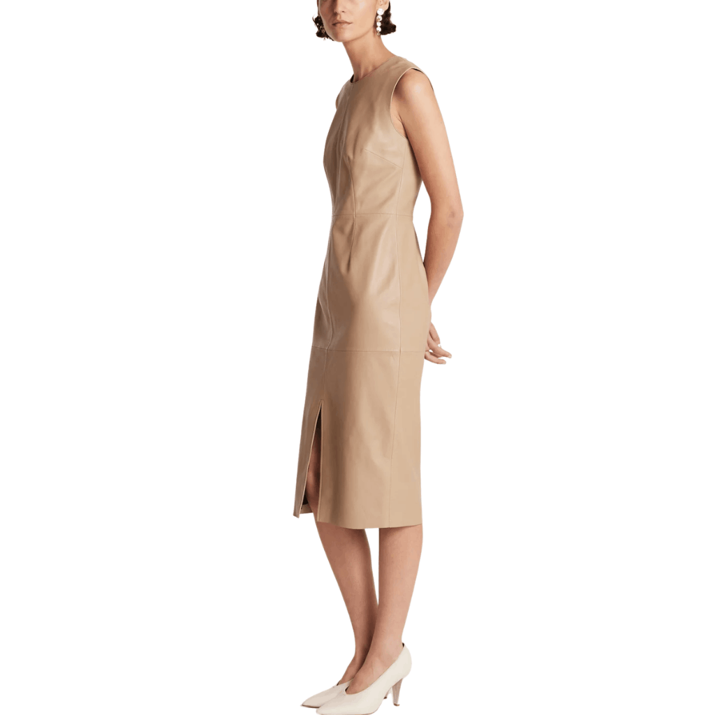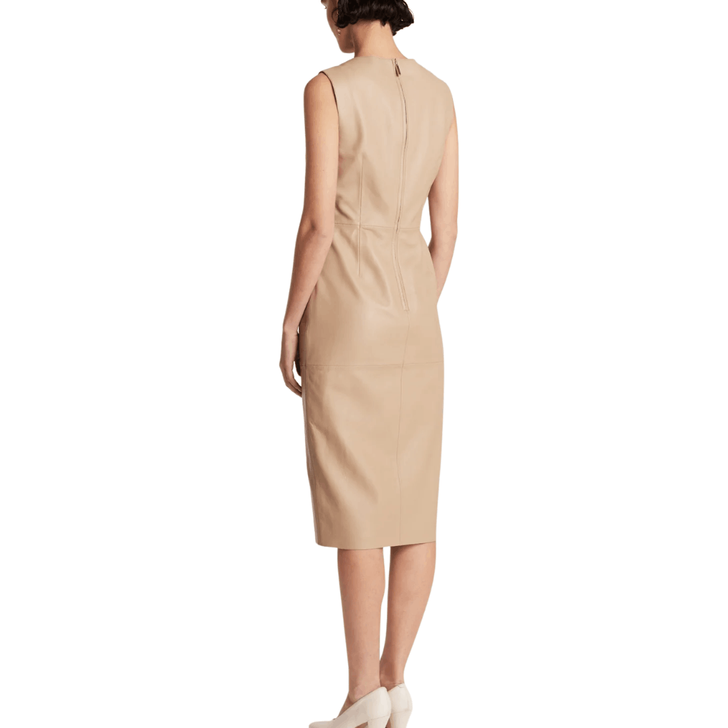 Make a confident style statement with this Sleeveless Leather Dress, crafted from premium lambskin leather. Â The sleeveless cut offers a clean, contemporary look, while seamed panel detailing improves the structure and creates a flattering fit. A front split adds just the right amount of movement and giving the dress a modern, fashion-forward finish.