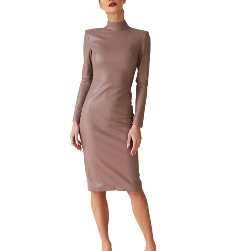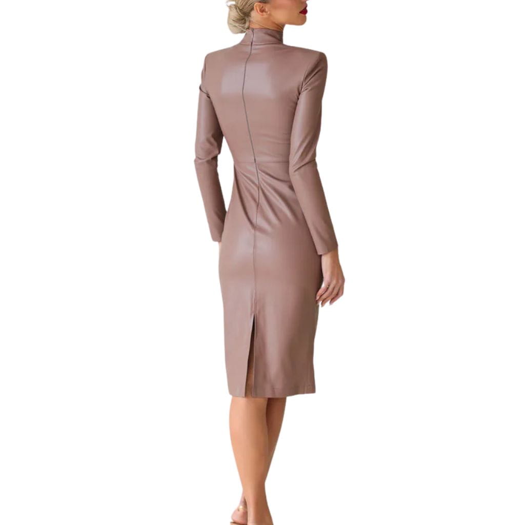 Crafted from faux leather, this dress delivers the luxe appeal of leather while remaining lightweight and comfortable for all-day or celebration wear. The chic funnel neck adds a fashion-forward touch, while the long sleeves balance the look with effortless sophistication.